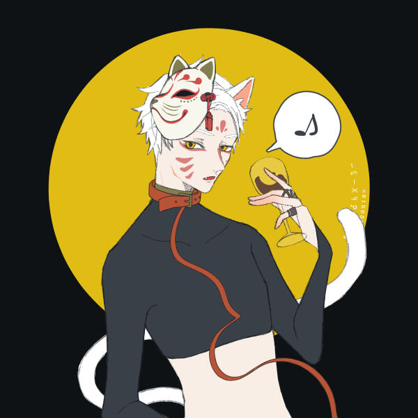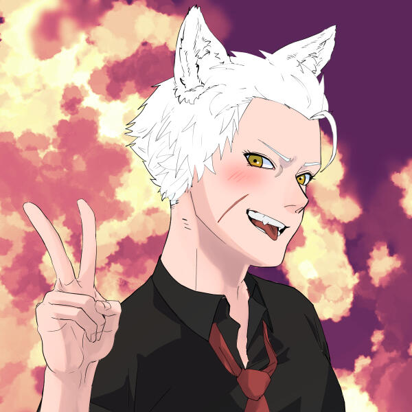 "Yuu is a wonderful person, especially so when you get to know him! He really looks out for his friends and his employees. He's very loving, and he makes me feel cherished all the time. He just has this weird habit of getting into trouble... He thinks its a curse and... he might be right! So if you're looking to cause him trouble, you're gunna have to get through me and my axe first! Oh, and he's funny, he likes to talk a lot, he's creative, he's sneaky, he loves scratching posts, he's (Razzie continues rambling off characteristics, a finger to her cheek as her eyes look upwards)..."